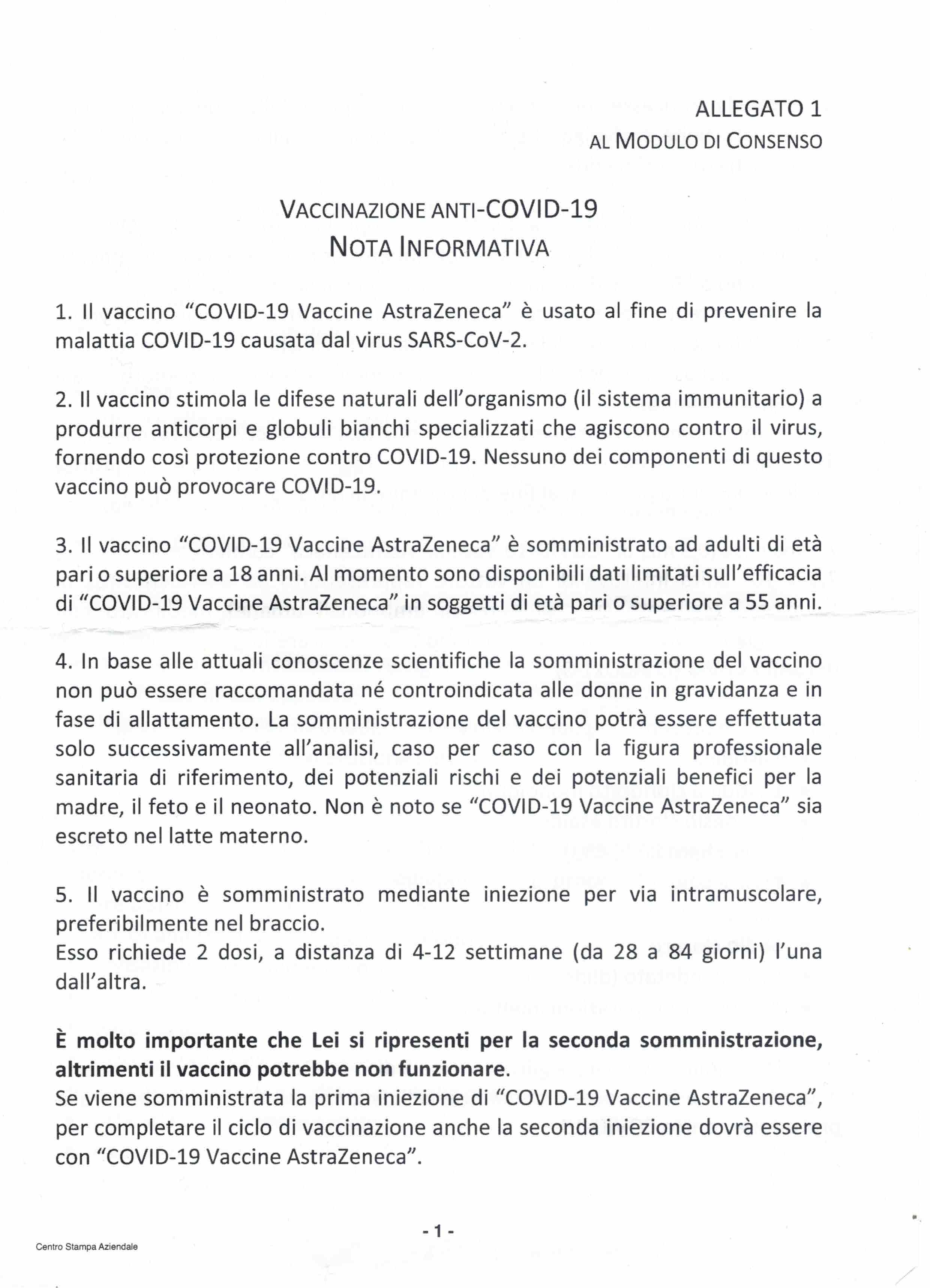 Vi allego qui il foglio di consenso “informato” consegnato ai miei familiari sul vaccino AstraZeneca (senza intestazione, senza il ben che minimo riferimento di chi o quale istituzione abbia rilasciato tale foglio “informativo”, nda).