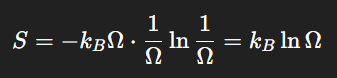 - Questa espressione viene considerata una generalizzazione della S=kBlnΩ di Boltzmann. Infatti, se tutti i microstati hanno la stessa probabilità pi=1/Ω allora la formula di Shannon si riduce a (vedi immagine a lato).